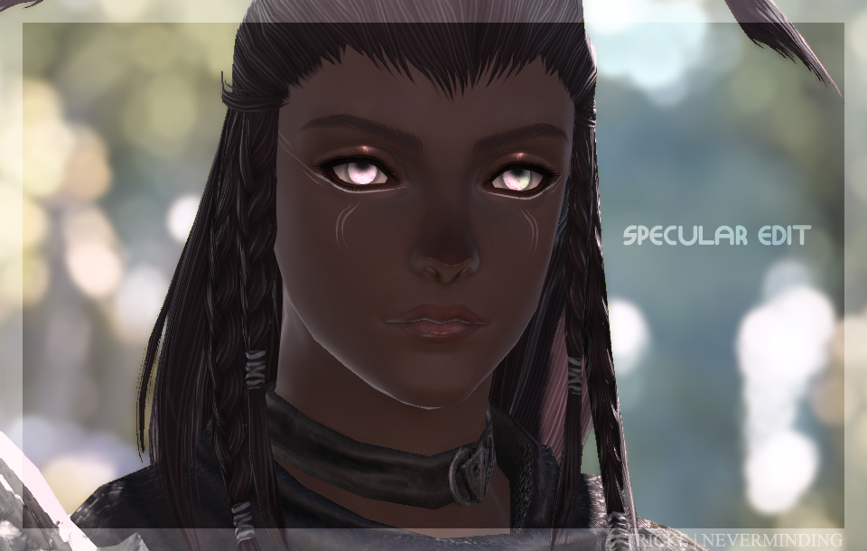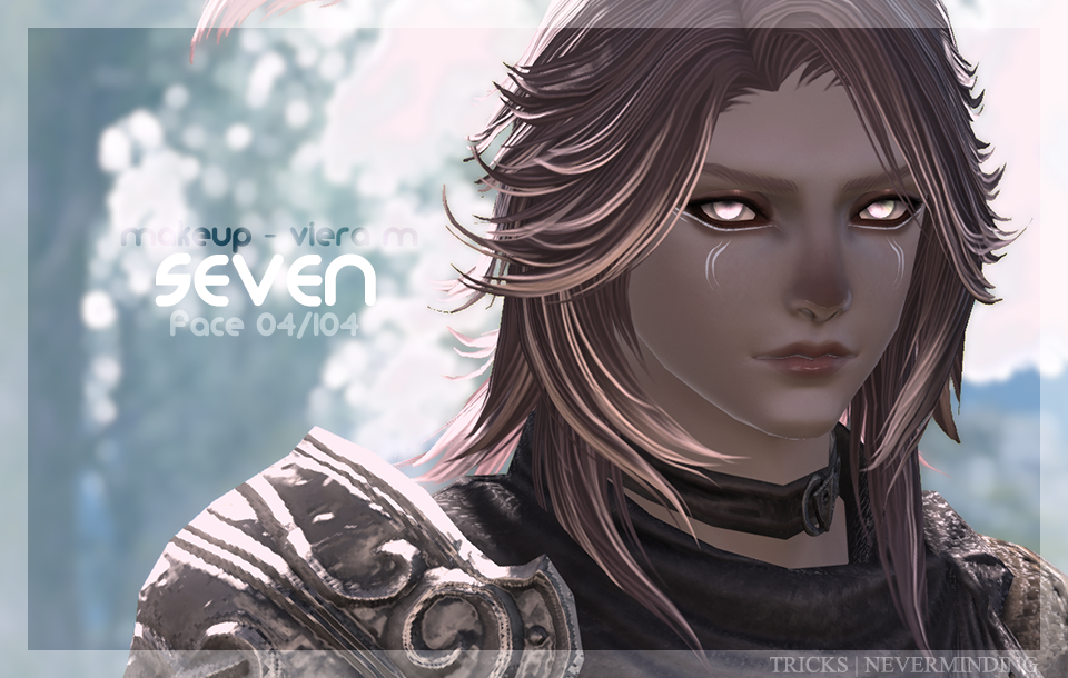 ❇ Description: Changes the Diffuse Map for Male Viera, Face 04/104, with a hand painted make-up. Includes custom markings, eye shadow & highlight, nose contour & highlight, and mat lips. Includes .PSD file for easy editing, which allows for removing or changing the colour of the markings, plus more.