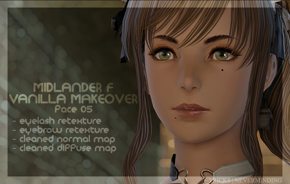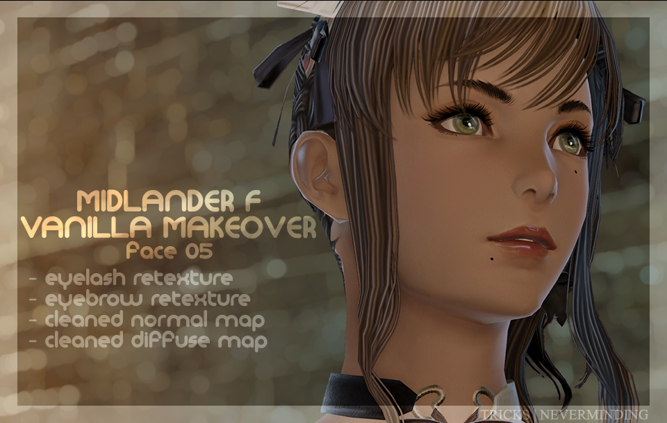 ❈ Description: A "Vanilla Makeover" for Feminine Midlander, Face 05. Includes Eyelash and Eyebrow Retexture, as well as a cleaned Normal Map and cleaned Diffuse Map. Intended to firmly keep the appearance of Vanilla Midlander, but with a little added love and care to remove some of the "crunchiness" on the original texture maps. May act as a base for your own creations (see permissions below).